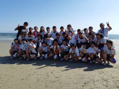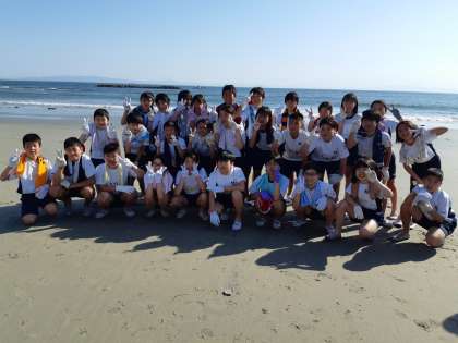 東浜に着きました。きれいな波です。まずはクラス写真。