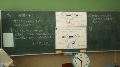算数で,時刻と時間の学習をしています。時計の模型を使って自分の考えを確かめながらの学習です。