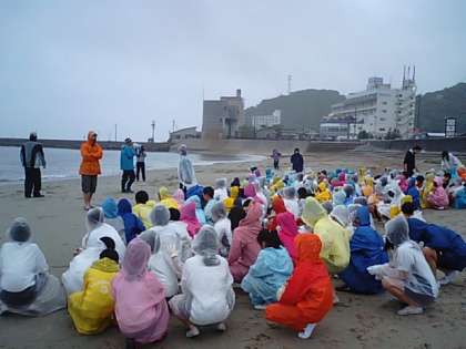 ホテル前の海岸に移動して地びき網に挑戦します。