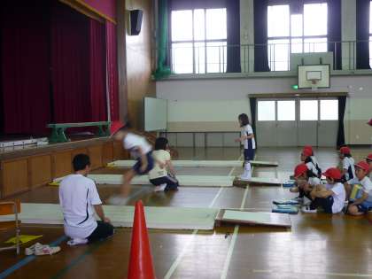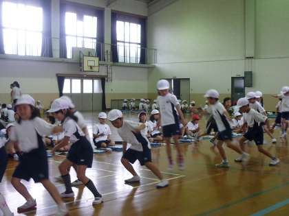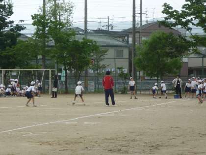 まず,4年生がボール投げ,反復横とび,立ち幅跳び等のテストを受けていました。