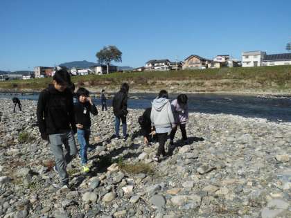 6年「土地のつくりと変化」の学習で、桂川まで石探しに行きました。ゲーム形式で石を集め見分ける中で、なんとなく石の特徴と種類がわかってきました。お気に入りの石をもって帰ってクラスで標本もつくりました。