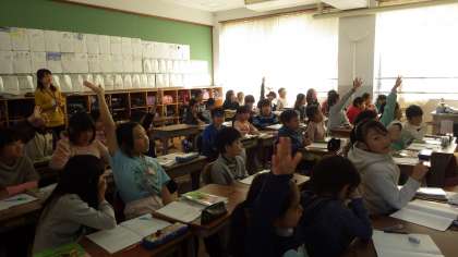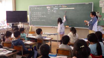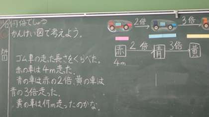 算数です。少し思考力のいる問題に取り組んでいます。みんなの考えを出し合いながら,解き方の見通しをもち,自分なりの方法で解決に向かっていました。