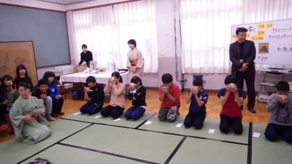 地域の方々に教えていただき,茶道体験をしました。プレールームを「和室」にこしらえ,作法を学びました。礼儀を重んじることの意義や伝統文化ということについても学びながら,お茶をいただきました。