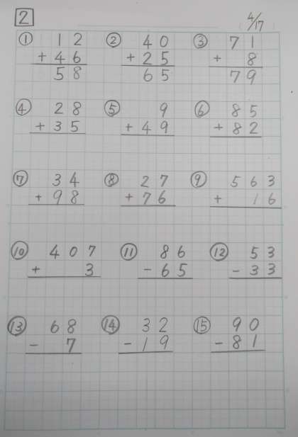 3年生の計算ドリルの2番と3番は2年生のふくしゅうになっています。