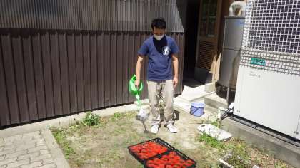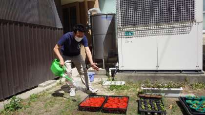 たねを植えたら水やりです。「大きくな〜れ。大きくな〜れ!」と気持ちを込めて水をやりました。