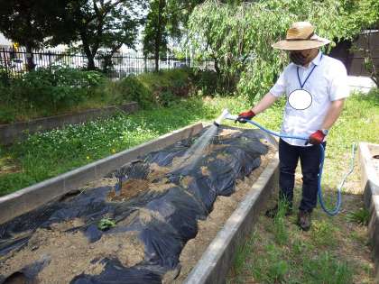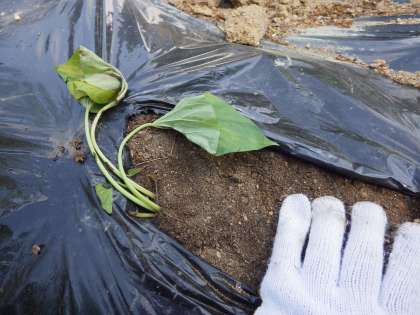 プールうらの さつまいも畑に うえてあるので 学校が 始まったら
