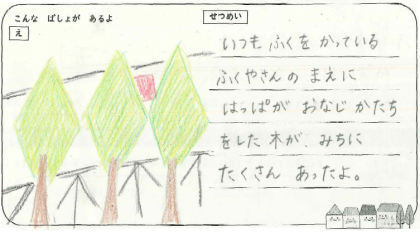 先生二人とも、まちの木が気になったんだけど、カードをかいてみたら ぜんぜん かきかたがちがっていたんだ。くらべてみると おもしろいね。