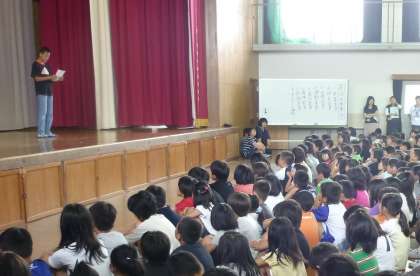 体育館では,各委員会の子がマイクなしでわかりやすく発表し,820名あまりの子どもたちが静かに聞いていました。今やこれが桂川小学校の伝統となりつつあります。