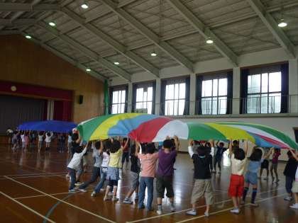今日は2年3組・4組の子どもたちとバルーンを使って交流をしました。