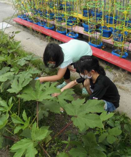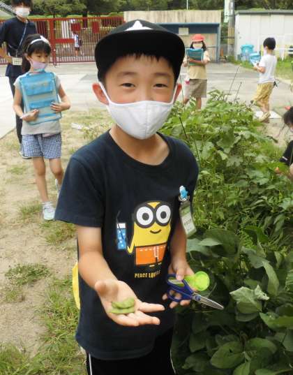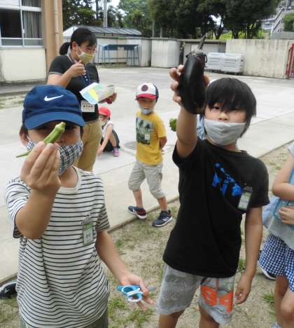 2年生は生活科で育てた野菜を収穫しました。ピーマンもなすびも立派に大きくなっています。オクラはちょっと大きすぎで硬いかも?!