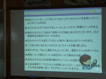 携帯電話の危険性について,携帯電話市民インストラクターの團野氏に来ていただき,PTA家庭教育講座が開催されました。小学生には切実な問題ではないかもしれませんが,決して無関心ではいられないものではないでしょうか。便利なものも使いようによっては,たいへん危険なものとなってしまいます。