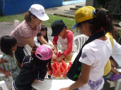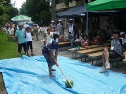 今年の『スイカ割り』は,なんと,本物のスイカを使って行われました。ビニールのスイカでやったときと比べて,子どもたちの目の色が違います。