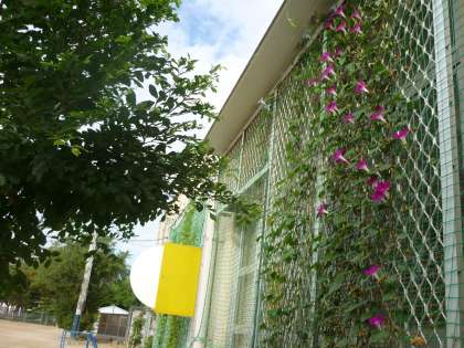 朝,職員室南側にはあさがおの花がたくさん咲いています。