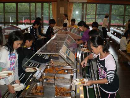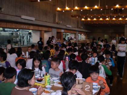 今日の夕食は食堂でのバイキングです。午後からの活動をがんばったこともあり、みんなすごい食欲です。何回もおかわりをする姿もたくさん見られました。