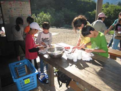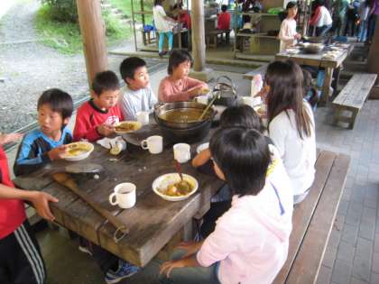 本日の目標「挑戦」の締めくくりは、「カレー作り」です。火おこしは比較的楽にできましたが、ごはんの水の量を間違えてとんでもないものができあがったり、カレーのじゃがいもが硬かったりと、若干苦戦しました。しかし、うまくできた班から分けてもらうなど、助け合いの精神で無事乗り切ることができました。