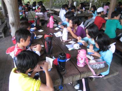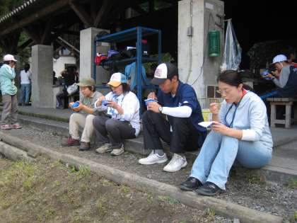 「冒険の森」での活動が終わって、「野外炊事」に移る前に、アイスを食べて「ちょっと休憩!」
