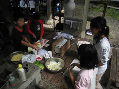 3度目の野外炊事ともなると、段取りがう〜んと良くなってきました。でも、玉ねぎを切るのと、煙にはなかなか慣れません。