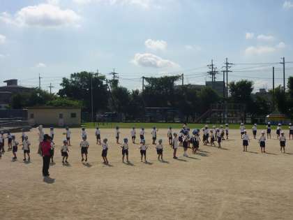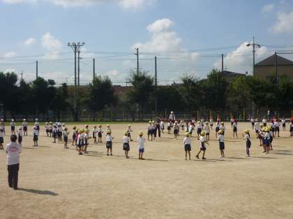 1年生は「玉入れ」(入退場)のダンスを運動場で練習しました。
