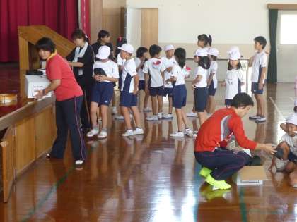 4年生は,今日初めて鳴子を配ってもらって各自が手にしました。