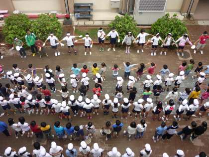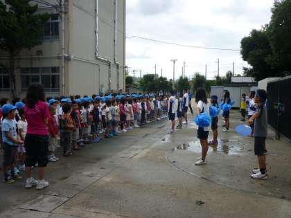 運動場の状態が思わしくないので,校内の各箇所に分かれて「応援の練習」を行いました。