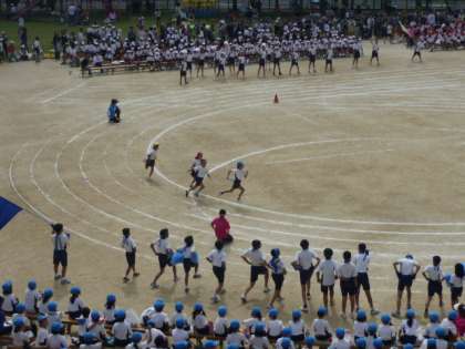 午前の最後の競技です。各色の熱い応援を背に,優勝目指して力いっぱいバトンをつないで走ります。