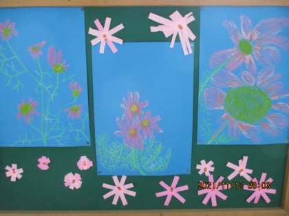 中庭のコスモスがたくさん咲きました。まず,コンテでていねいに線描きをしました。次に,パスで彩色しました。花びらを一枚ずつ数えて,花や葉っぱの重なりを意識して,よく見て大胆に。また,色紙を切って,のりではり合わせ,コスモスの花をつくりました。
