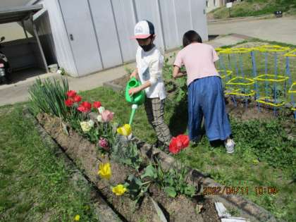中庭や学校園でたくさんの花が咲いています。水やりをしながら,いろいろな花の観察をしました。