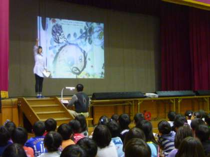 今日は,朝会のあと,えほん館の方に本の紹介をしていただきました。