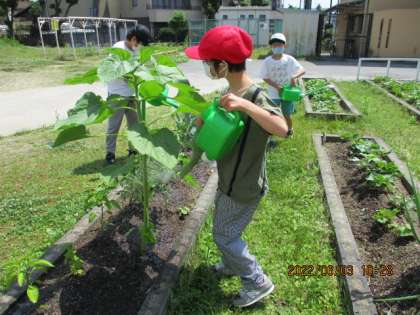 夏野菜の水やり,観察に行きました。この1週間でヒマワリの草丈がぐんぐんのびています。1m定規をあてたり,自分の背丈と比べたりしました。