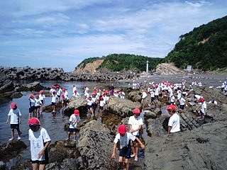 潮だまりには,ヤドカリ,小魚,イソギンチャクなどたくさんの生き物が見られます。子どもたちは歓声をあげながら活動しています。