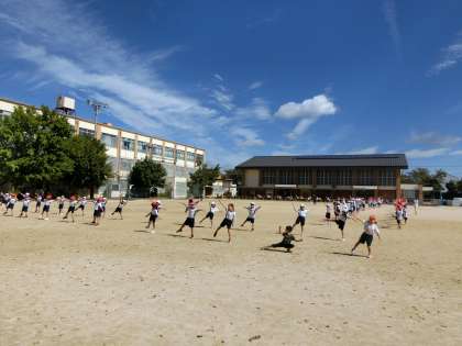 運動場に出て学年で一緒に踊り始めました。みんなで踊るとやっぱりもっと楽しいです。体育参観では,よりのりのりで踊る姿が見られるのではないかと思います。