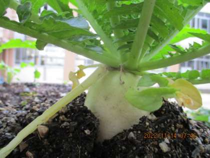 9月に種まきをしたダイコンが大きくなっています。また、一緒に種まきした二十日ダイコンの収穫をしました。ピンク色のかわいい二十日ダイコンでした。