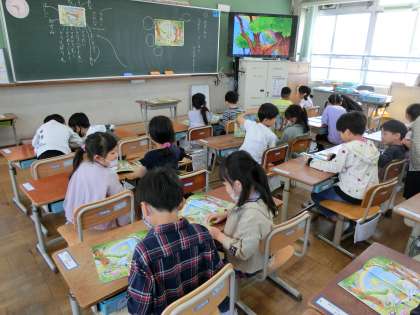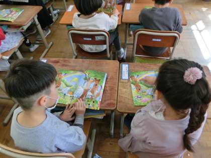 絵を見て,そこにいる子供や動物たちが何と言っているのかを想像しながら話しました。ペアでお話ししている様子です。