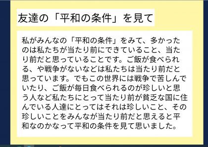平和であることの条件は何かを考え、友達の意見もいかしながら、自分だけでの「平和の条件」についてまとめました。