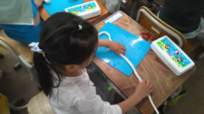 図画工作科で「ひもひもねんど」をしました。色々な長さや太さのひもを作って、そのひもで好きなものを作りました。高く重ねたりくるくる巻いたり、工夫して作りました。夢中になって楽しく作っていました。