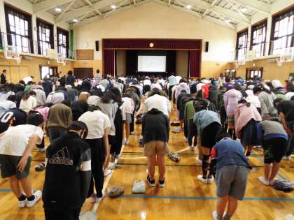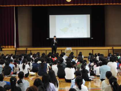 3年ぶりに全校生が体育館に集まっての朝会をおこないました。