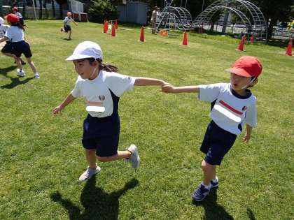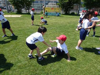 友だちと一緒に手をつないでおにごっこをしたり、押しずもうや引っ張りずもうをしたりしてかかわることができました。