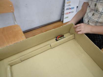 箱の裏で磁石を動かすと箱の上の車が動き迷路を進むという仕組みです。