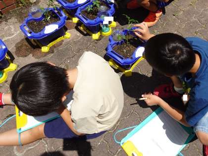 苗を植えた後、ミニトマトの苗の様子をじっと観察!!