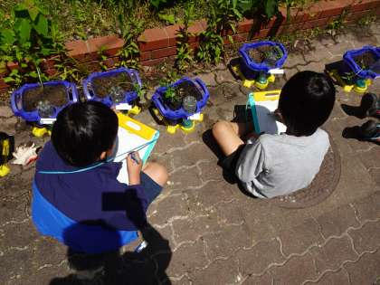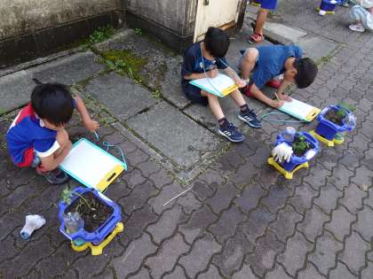 手触りを確かめたり、葉っぱの数を数えたり、よーーーーく見て、絵と文でカードに記録しました。