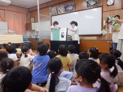 中間休みに本のたねさんによる読聞かせがありました。「ともだちや」という本を,楽器を使って読み聞かせしてくださいました。本好きの子たちに育ってほしいです。