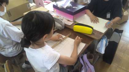 いろいろな段ボールを持ってきて子どもたちはやる気満々!今日は、どんなオリジナルの箱を作ろうかと考えました。友だちと相談したり、教科書を見たりしてアイデアが広がったようです。