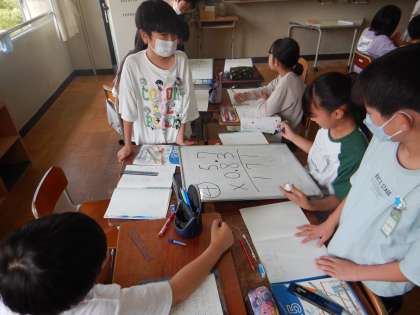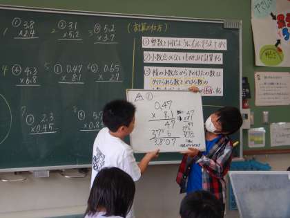 授業後半には、今まで学習してきた事を生かしながら、「10倍にして整数にしよう!」と考えてやったり、計算の手順をグループごとに話合い、発表しました!