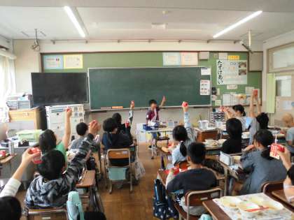 お誕生日の子がいたので、給食の牛乳で乾杯しました。