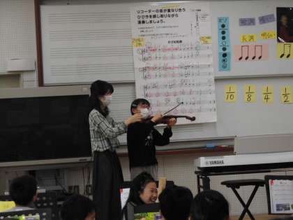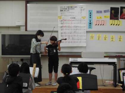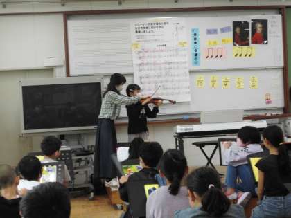 音楽の時間に、先生のバイオリンを実際に触らせてもらいました。