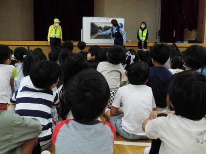 道路を渡るときは立ち止まって右・左・右と安全を確かめることを模擬道路を使って体験したり、しっかりお話をきいて取り組めました。