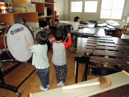 大きなピアノやたくさんの楽器に大よろこびで、さわって音をたしかめていました。
