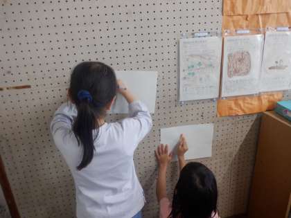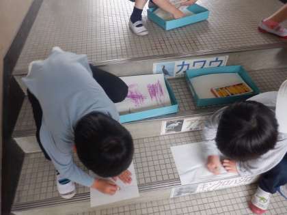 図工科の学習で,教室や廊下のでこぼこを探しました。クーピーやパスでこすりだし,でこぼこの楽しさを味わいました。「見て見て〜!こんなん発見したでー!!」ととても楽しそうに探していました。