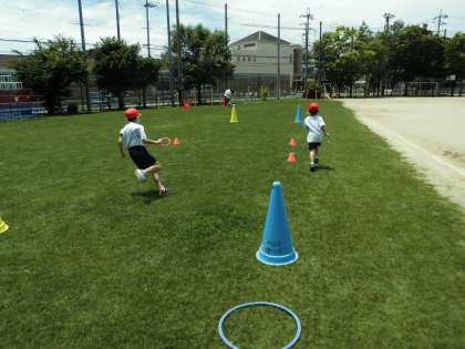 初めて取り組んだ1年生は、コーンをぴょんぴょん跳び越えて、ゴールまでしっかり走り抜けていました。
