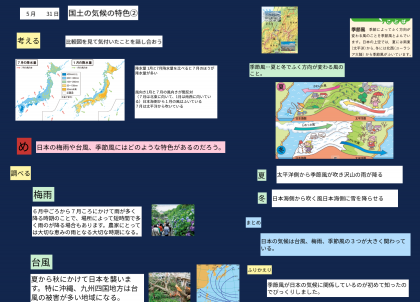 季節風についてしっかり考え、気候に及ぼす影響など話し合い学習を進めることができました。次の学習は、日本各地の降水量や気温を比較し、気候の特色を考えます。